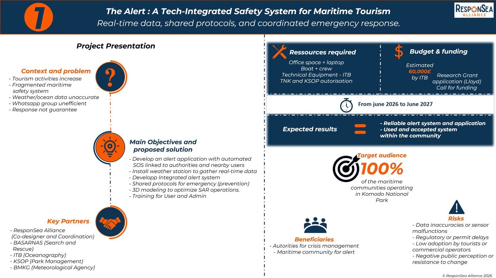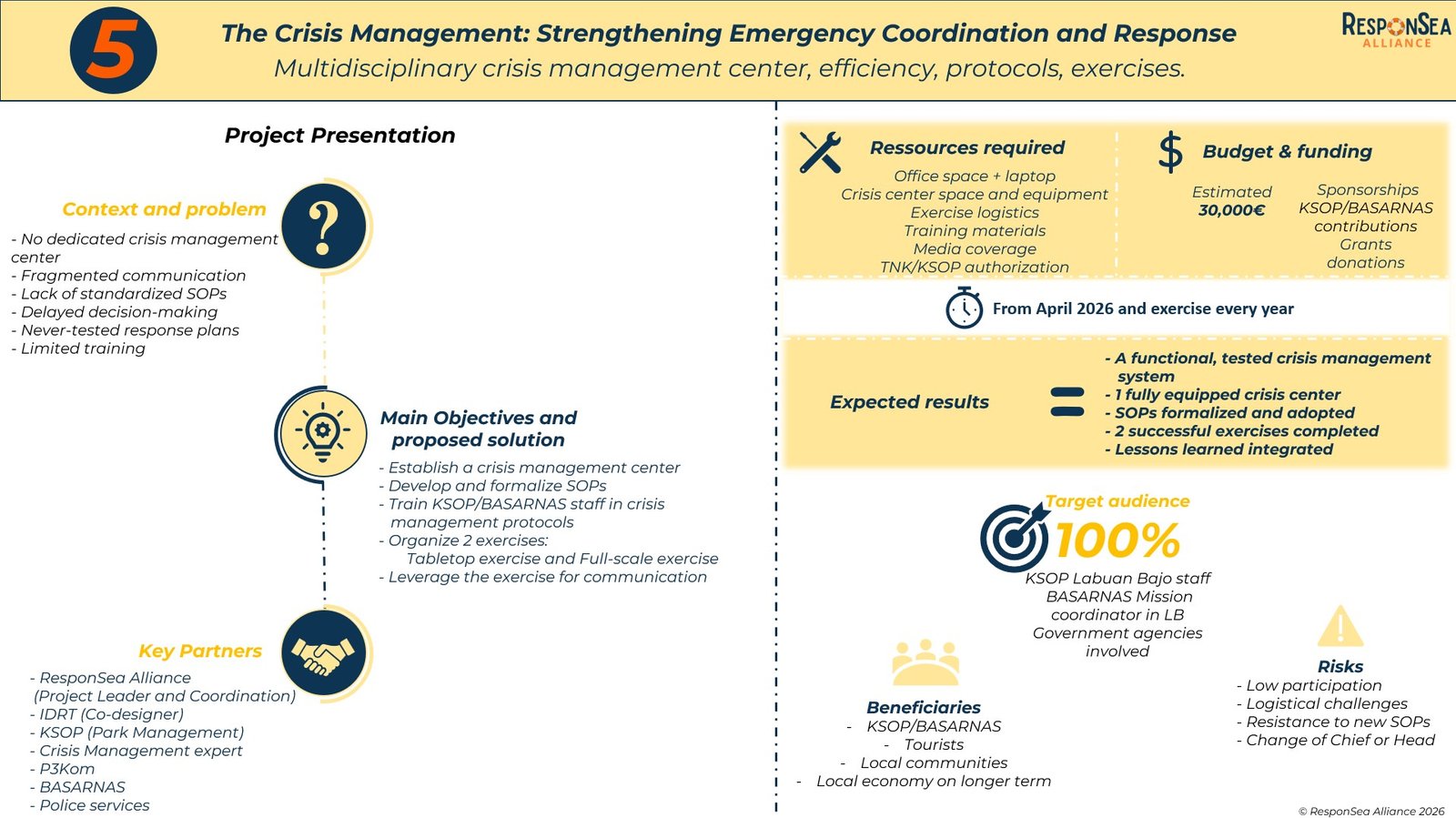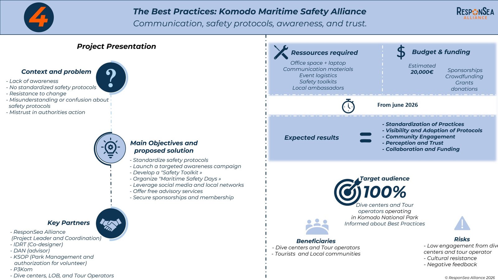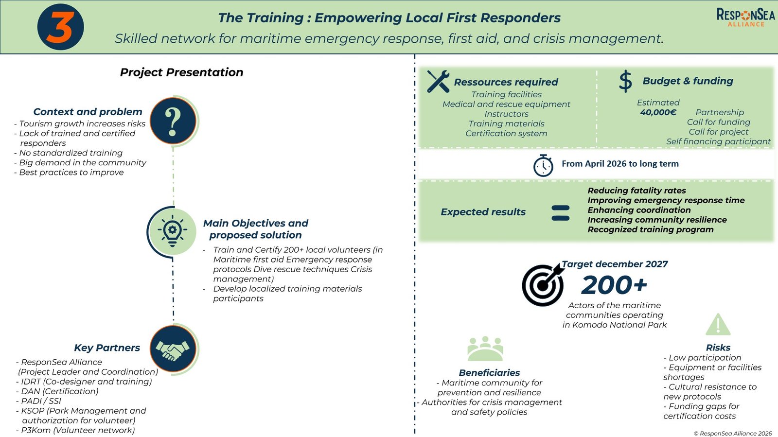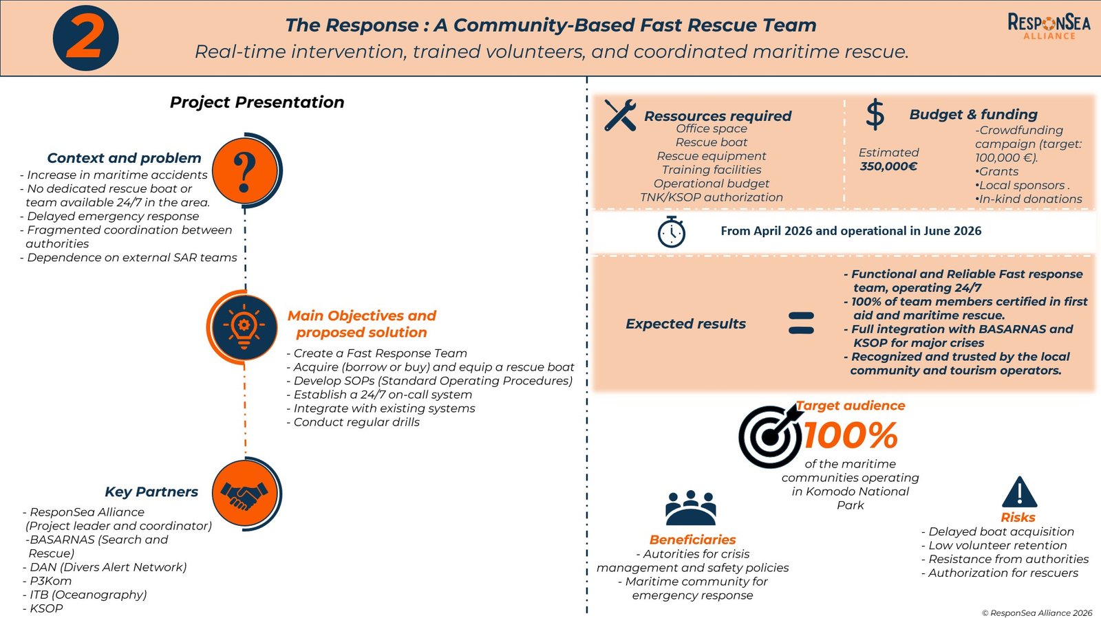 ResponSea está estableciendo el primer equipo de respuesta rápida marítima dedicado en el Parque Nacional de Komodo. Compuesto por voluntarios capacitados, esta unidad independiente operará las 24 horas del día, los 7 días de la semana, cubriendo vacíos críticos en la respuesta al proporcionar asistencia inmediata mientras se espera la intervención oficial de los equipos de búsqueda y rescate (SAR), garantizando una acción más rápida que salva vidas.